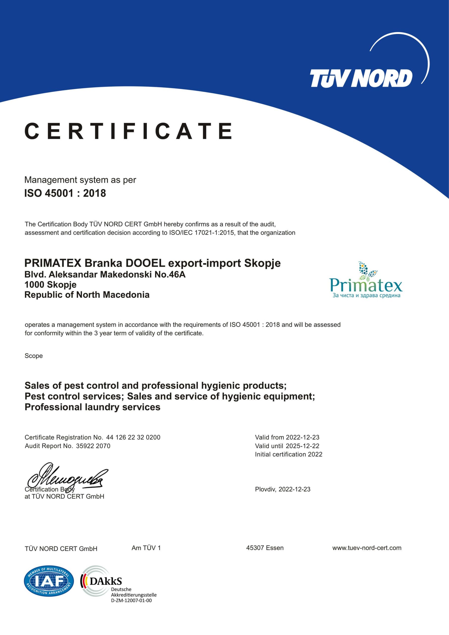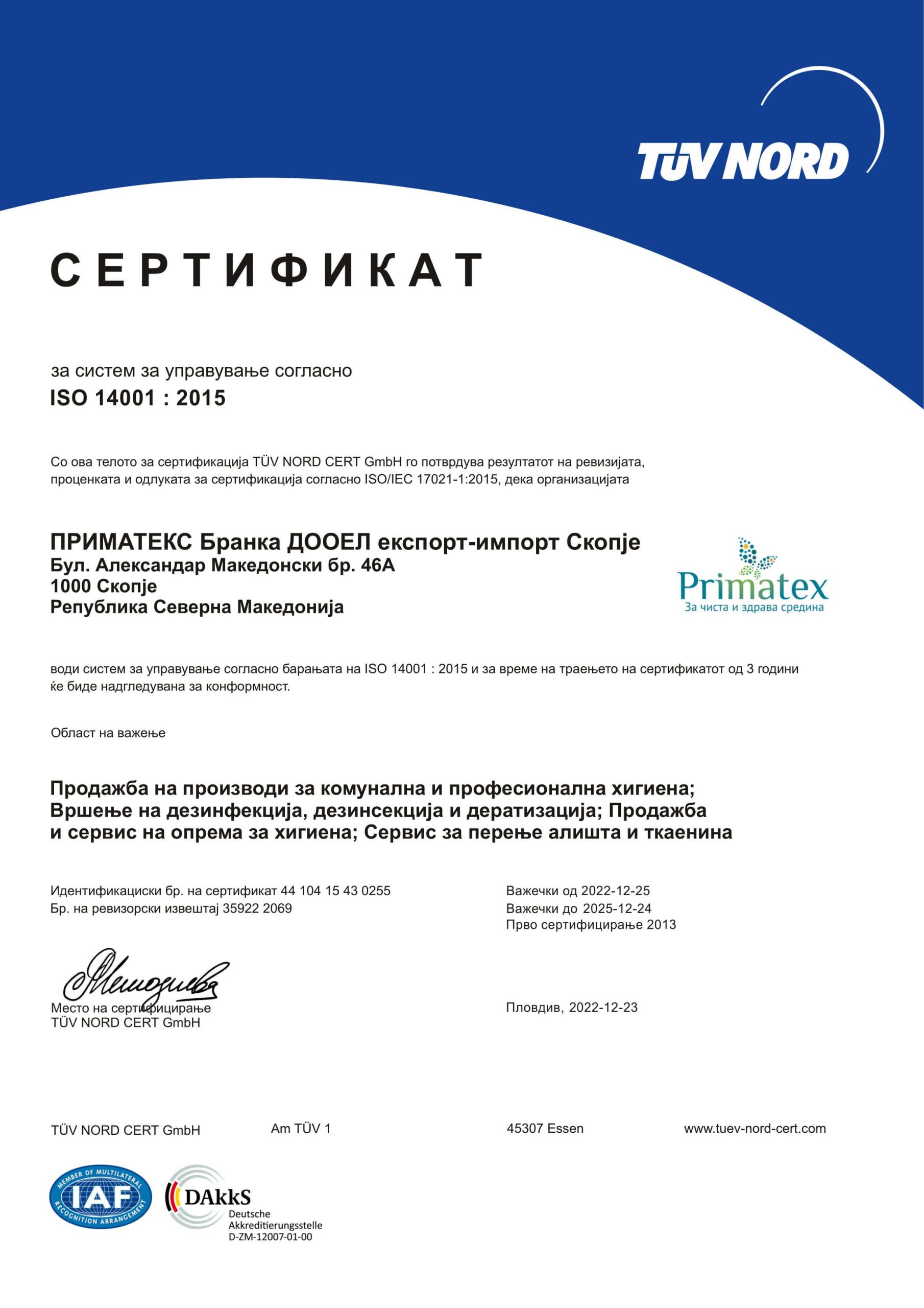 Управителот ја утврдува Политиката за ИМС (ISO 9001-2015/14001-2015/45001-2018 EN16636) во сооднос со Визијата и Мисијата на Друштвото. Со Политиката за ИМС, е искажан односот на ПРИМАТЕКС према: